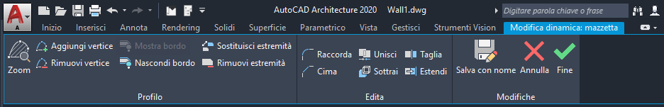 La modifica dinamica rappresenta una modalità speciale di modifica che consente di intervenire su componenti oggetto basati su polilinea o profilo direttamente sullo schermo; al contempo l'accesso ad altre funzioni di modifica è limitato. Ad esempio, in modalità di modifica dinamica è possibile apportare modifiche ad una mazzetta, ma non salvare e chiudere il disegno. Quando si disattiva la modalità di modifica dinamica, è possibile scegliere se ignorare le modifiche, sovrascrivere con le modifiche la definizione di componente esistente o salvarle come nuova definizione.