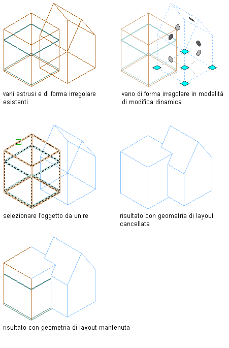 Per unire un vano di forma irregolare 3D ad un vano o ad un altro oggetto AEC, attenersi alla procedura indicata di seguito. I vani di forma irregolare 3D possono essere uniti a qualsiasi oggetto AEC con geometria 3D.