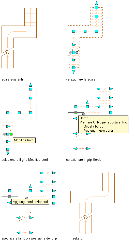 Per modificare gli angoli e le posizioni dei bordi dei pianerottoli in scale a forma di U e a più pianerottoli, attenersi alla procedura indicata di seguito. Ogni bordo del pianerottolo può essere spostato in modo indipendente utilizzando i punti di grip.