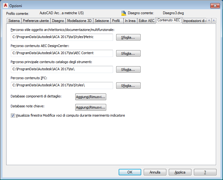 - È consigliabile non salvare i file di contenuto AEC personalizzati nelle cartelle Imperial e Metric, ma salvarli in una cartella a parte. È possibile visualizzare il percorso per il contenuto AEC personalizzato nella scheda Contenuto AEC della finestra di dialogo Opzioni. Nel percorso indicato in Percorso contenuto AEC DesignCenter è possibile creare un numero illimitato di sottocartelle. Sarà possibile accedere a tali sottocartelle nella scheda Contenuto AEC del Design Center di AutoCAD. Il contenuto di tali sottocartelle avrà le stesse caratteristiche di qualsiasi altro tipo di contenuto AEC.