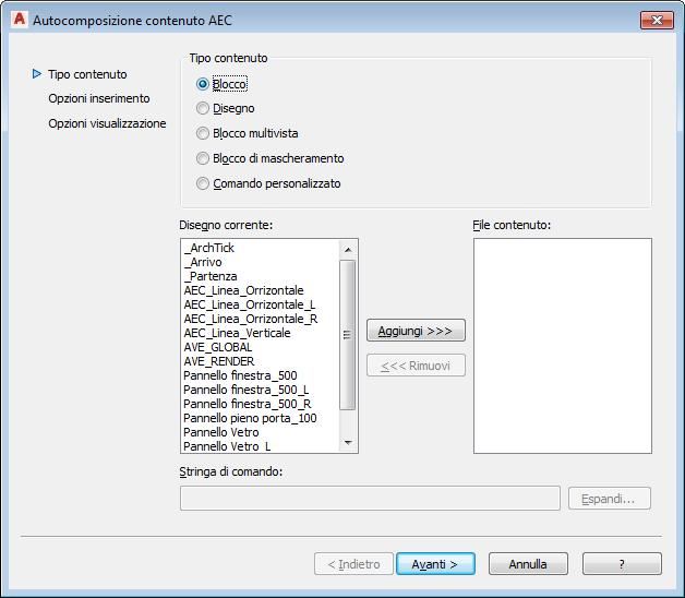- Gli eventuali blocchi 2D e 3D di AutoCAD esistenti possono essere convertiti direttamente in contenuto AEC impostando il tipo di contenuto su Blocco nell'Autocomposizione Crea contenuto AEC.