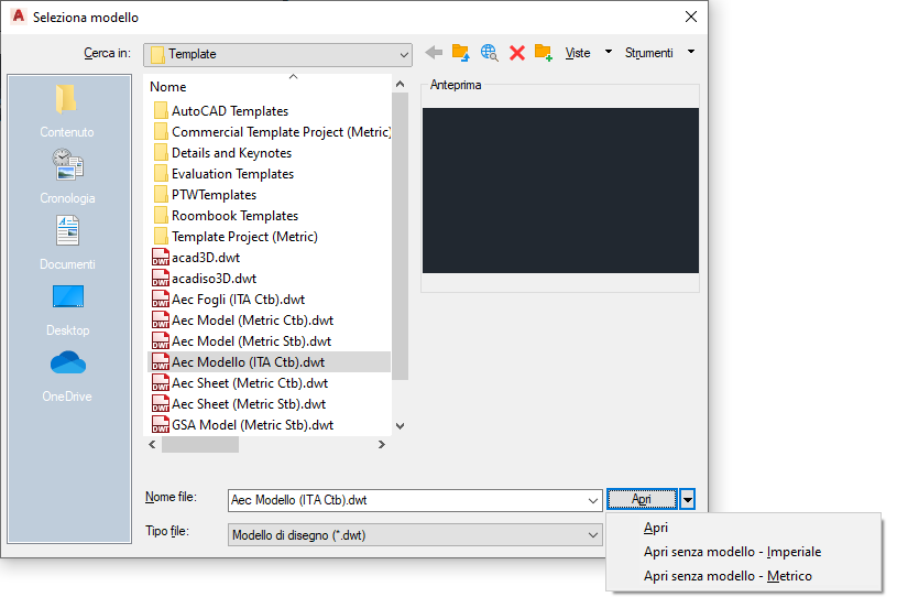 - Utilizzare un disegno vuoto. Anziché utilizzare il comando CNuovo, che procede al caricamento di un modello, utilizzare il comando NUOVO e scegliere Apri senza modello - Imperiale dall'elenco a discesa del pulsante Apri.