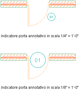 Nella seguente illustrazione l'indicatore di porta viene visualizzato in due diverse scale di annotazione e in diverse posizioni, a seconda della scala di annotazione e del punto base.