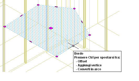 Il grip Bordo presenta tre modalità di modifica: Offset, Aggiungi vertice e Converti in arco. La modalità di default Offset consente di spostare il bordo selezionato perpendicolarmente al punto medio del bordo stesso. A seconda della forma del profilo e del bordo che si desidera modificare, le linee vicine possono essere estese o ritagliate e possono essere aggiunte nuove linee.