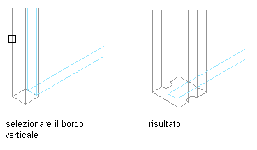 Per assegnare un profilo ad un bordo verticale di un infisso o di un montante verticale, attenersi alla procedura indicata di seguito. Il profilo può essere un qualsiasi profilo o una qualunque polilinea chiusa specificata. È possibile utilizzare un bordo con profilo per creare un angolo specifico in situazioni in cui una semplice giuntura non è sufficiente.