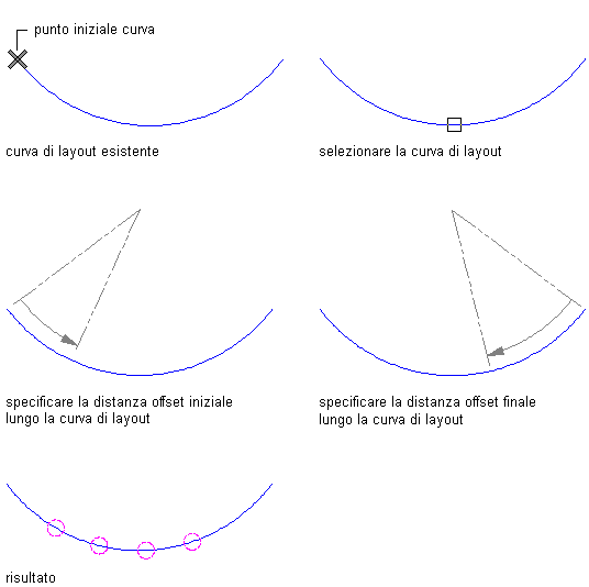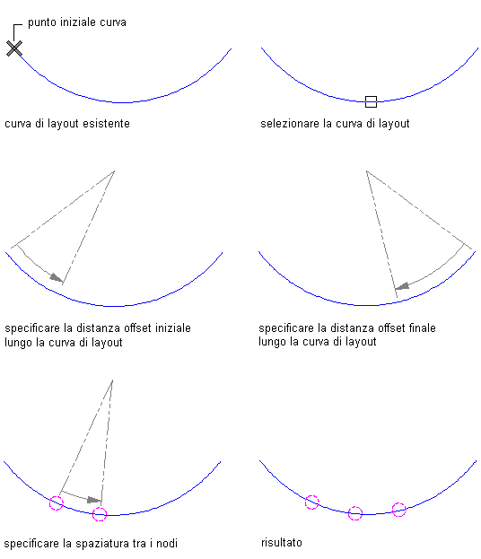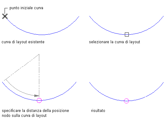 Posizionare i nodi nei punti specificati Premere INVIO. Immettere il numero di nodi e specificare la posizione dei nodi selezionandoli o immettendo le distanze dal punto iniziale della curva.