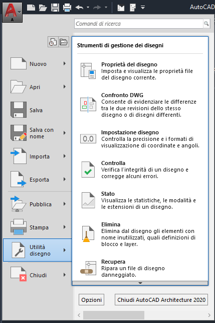 Nel menu dell'applicazione sono disponibili comandi di base relativi al disegno nel suo complesso, quali Apri, Salva, Stampa, Esporta. Come per il browser menu, per accedere al menu dell'applicazione è sufficiente fare clic su