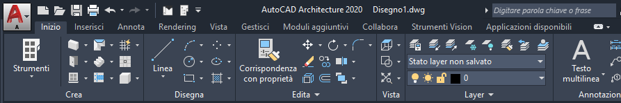 Set di strumenti AutoCAD Architecture 2027 è dotato di una sola area di lavoro di default: Architecture. Per accedere a menu e comandi associati alle aree di lavoro precedenti (Design, Documento, Dettagli e Visualizzazione), è ora possibile utilizzare le schede della barra multifunzione.