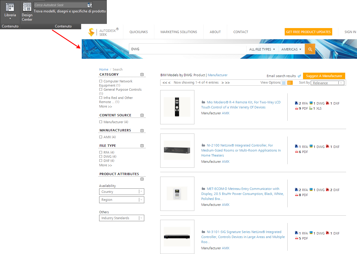 Con Autodesk Seek è possibile ricercare informazioni di design del prodotto. Numerosi provider di contenuti, sia partner aziendali che singoli collaboratori, eseguono pubblicazioni in Autodesk Seek. Tra i contenuti pubblicati sono inclusi modelli 3D, disegni 2D, specifiche, depliant e altre descrizioni di prodotti o componenti.