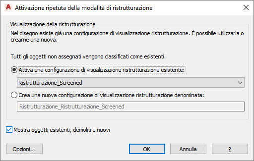 Quando si attiva la modalità di ristrutturazione in un disegno aperto in precedenza, è possibile continuare ad utilizzare la configurazione di visualizzazione di ristrutturazione esistente o crearne una nuova.