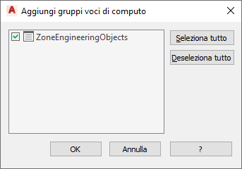 4. Nella finestra di dialogo Aggiungi gruppi voci di computo, selezionare ZoneEngineeringObjects e fare clic su OK.