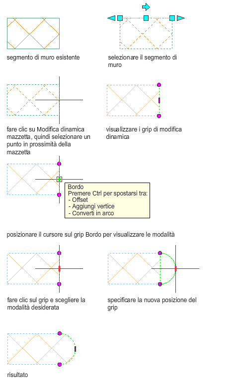 Per convertire il bordo di un componente muro in arco mediante i grip Bordo, attenersi alla procedura indicata di seguito.