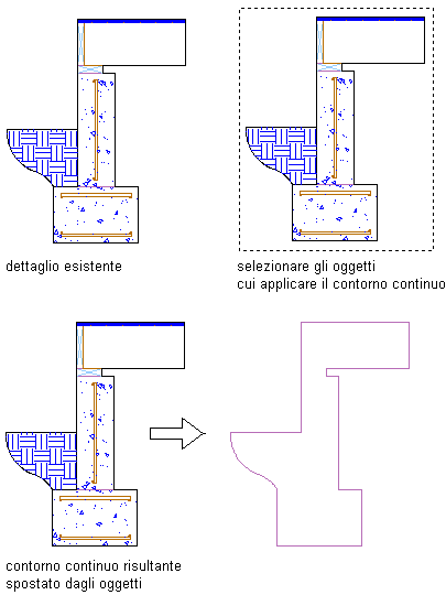 Per creare automaticamente un profilo o un contorno continuo intorno ad un insieme di entità disegno al tratto contigue, inclusi gli oggetti architettonici, attenersi alla procedura indicata di seguito. Il risultato visualizzato al termine della procedura è simile a quello ottenuto dall'unione di entità, con la differenza che in questo caso il contorno costituisce un'entità selezionabile distinta. Diversamente dagli altri strumenti di disegno al tratto AEC, lo strumento Contorno continuo è disponibile nella tavolozza degli strumenti Di base. Il comando AECLINEWORKSHRINKWRAP richiamato dallo strumento è contenuto in un comando DesignCenter per il supporto delle chiavi layer. Ciò significa che le polilinee del contorno continuo create mediante questo strumento vengono automaticamente posizionate sul layer specificato dalla chiave layer associata.