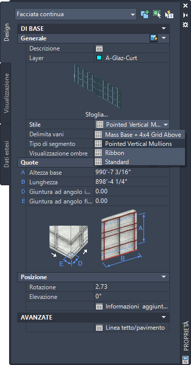 Per selezionare uno stile diverso per la facciata continua nel riquadro proprietà, attenersi alla procedura indicata di seguito.