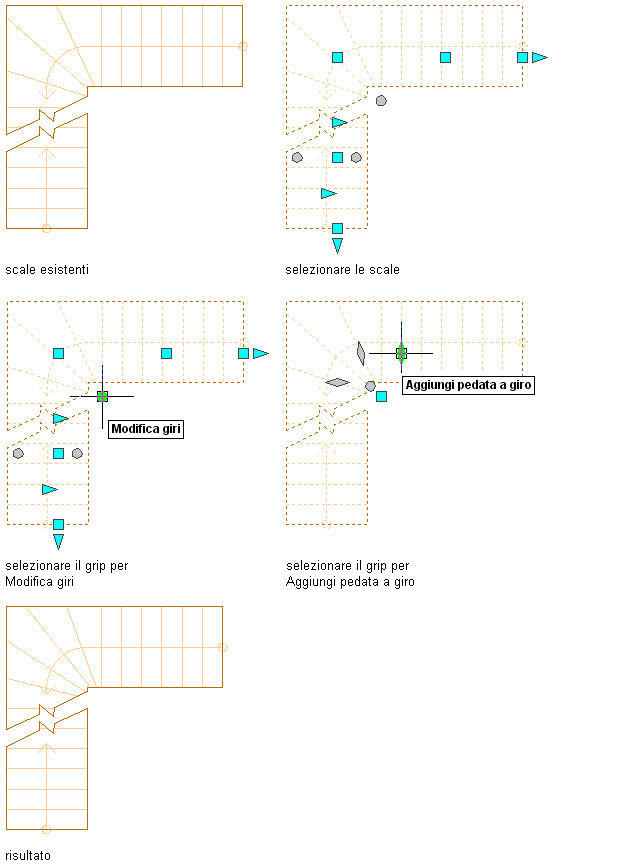 6. Al termine dell'aggiunta di pedate, è possibile fare clic sul grip Esci da Modifica giri per tornare alla modalità di modifica scala di default oppure fare clic con il pulsante destro del mouse e scegliere Deseleziona tutto per disattivare i grip.