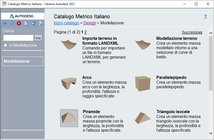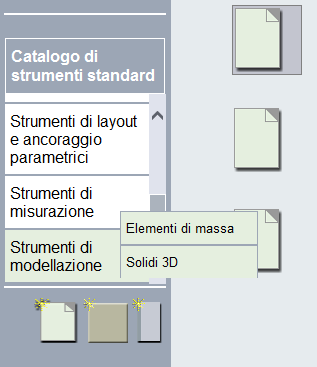 Le categorie sono a loro volta suddivisibili in uno o più livelli. Se vi sono sottocategorie, spostando il puntatore sui nomi delle categorie nel riquadro sinistro ne viene visualizzato l'elenco. Ad esempio, nel catalogo di strumenti standard, spostare il puntatore su Strumenti di modellazione per visualizzare le sottocategorie Strumenti di elementi massa e Solidi 3D.