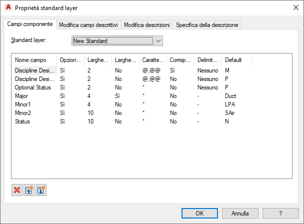 Ogni standard layer definisce il numero di campi componente che compongono un nome di layer e specifica le convenzioni per il contenuto consentite in ogni campo. Se si crea o modifica uno standard layer, si accede alle proprietà dello standard layer per modificare i campi componente.