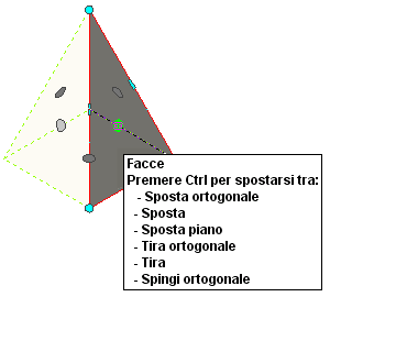 | Spostare la faccia ortogonalmente mantenendo invariati i piani delle facce adiacenti | Fare clic con il pulsante del mouse sul grip Faccia e tenerlo premuto, quindi premere CTRL due volte e specificare la nuova posizione della Faccia. | Spostare il piano della faccia, mantenere invariato il piano delle facce adiacenti |