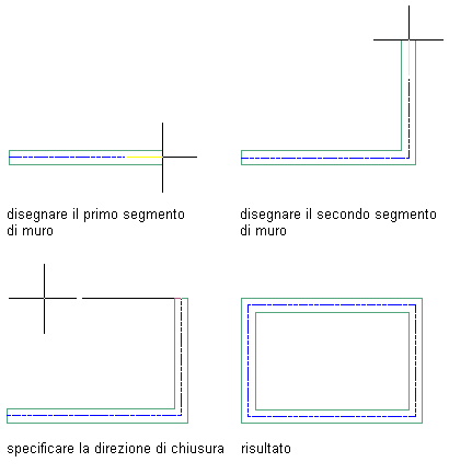 Questa opzione consente di chiudere il muro creando un segmento di muro tra l'ultimo punto specificato per i muri e il primo punto specificato nel gruppo di muri. Per applicare questa opzione all'inserimento di muri, immettere c (Chiudi) nella linea di comando.