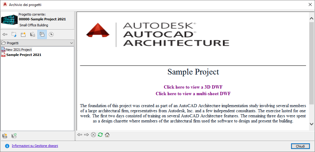 Nell'Archivio dei progetti è possibile creare nuovi progetti, configurare le impostazioni del progetto e gli standard di progetto, aggiungere informazioni di dettaglio e selezionare il progetto corrente. Se un progetto viene impostato come corrente scegliendo l'apposito comando dal menu di scelta rapida o facendo doppio clic sul nome del file, il progetto viene convertito in un formato compatibile con la versione corrente del Set di strumenti AutoCAD Architecture 2027. Se si aggiornano i percorsi del progetto, tutti i disegni del progetto vengono migrati e non sarà più possibile aprire il progetto in versioni precedenti del software.