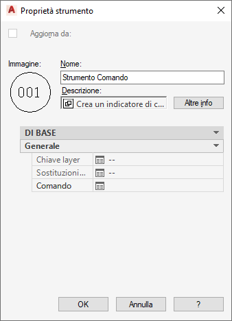 - Strumento Comando: strumento di comando vuoto, che consente di eseguire varie sequenze di comandi. I comandi consentiti includono i comandi di AutoCAD e di Set di strumenti AutoCAD Architecture 2027, le macro e le applicazioni VBA, le routine AutoLISP e gli script.