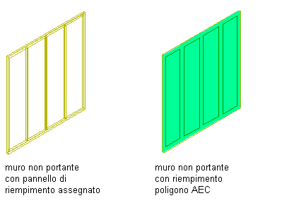 Una facciata continua può comprendere pannelli facciata continua. I pannelli facciata continua sono simili alle facciate continue, con la differenza che le celle della griglia possono contenere solo riempimenti pannello e non oggetti. I pannelli facciata continua vengono utilizzati per rappresentare elementi complessi che si ripetono nella facciata continua principale. È possibile utilizzare i poligoni AEC per il riempimento di griglie in un pannello facciata continua.
