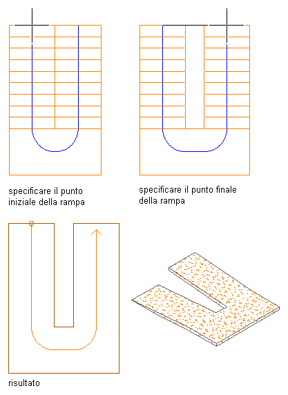 Per creare una rampa mediante le scale, attenersi alla procedura indicata di seguito. Lo stile Rampa-calcestruzzo nel disegno Stili di scala comprende le impostazioni corrette per la creazione di una rampa.
