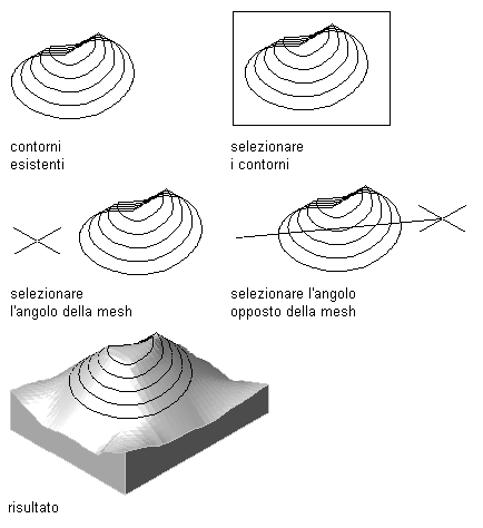 Una superficie definita dai valori immessi per le curve di livello e i punti (triangolazione Delaunay) Immettere n (No) al prompt Generare una mesh normale [Sì/No].
