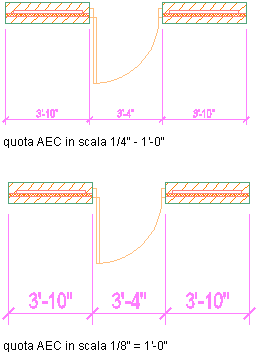 Nella seguente illustrazione la quota AEC viene visualizzata in due diverse scale di annotazione. La quota AEC è stata creata nel disegno nella prima scala di annotazione, quindi tale scala è stata cambiata.