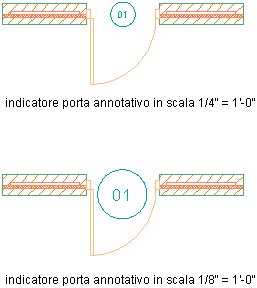 Nella seguente illustrazione l'indicatore di porta viene visualizzato in due diverse scale di annotazione. L'indicatore di porta è stato creato nel disegno nella prima scala di annotazione, quindi tale scala è stata cambiata.