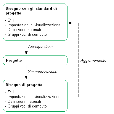 Il confronto tra il progetto e i relativi standard può essere eseguito in qualsiasi momento nel corso del progetto e, se vengono individuate discrepanze tra gli standard e i disegni del progetto, è possibile avviare la sincronizzazione. Se necessario, è anche possibile aggiornare gli standard dai disegni del progetto.