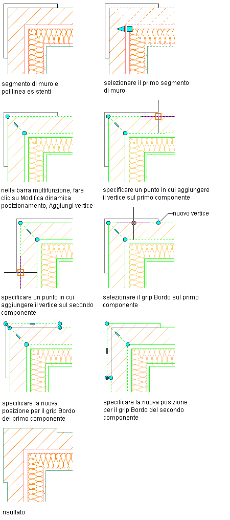 Nell'esempio seguente vengono aggiunti nuovi vertici ai componenti, quindi una condizione di angolo con rivestimento esterno in mattoni viene modificata con i grip Bordo.