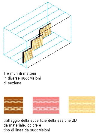 Nella creazione di suddivisioni nello stile, l'intenzione è di ottenere degli oggetti distinti dal punto di vista visivo rispetto ad altre suddivisioni. Durante l'assegnazione di materiali agli oggetti, è possibile impostare lo stile di sezione 2D in modo che utilizzi il modello di tratteggio legato al materiale, ma che utilizzi il colore e il tipo di linea legati alle proprietà di visualizzazione della suddivisione.