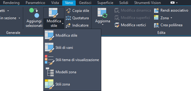 A seconda dell'oggetto selezionato, potrebbe essere possibile accedere non solo agli stili relativi a tale oggetto, ma anche agli stili di oggetti che funzionano da oggetti di supporto. Ad esempio, quando si seleziona un vano è possibile accedere agli stili di vano, agli stili di zona, ai modelli di zona e agli stili del tema di visualizzazione.