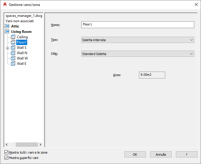 . Per visualizzare tutti i vani nel disegno, con tutte le superfici e le relative aperture, verificare che le opzioni Mostra tutti i vani e le zone e Mostra superfici vani siano selezionate.