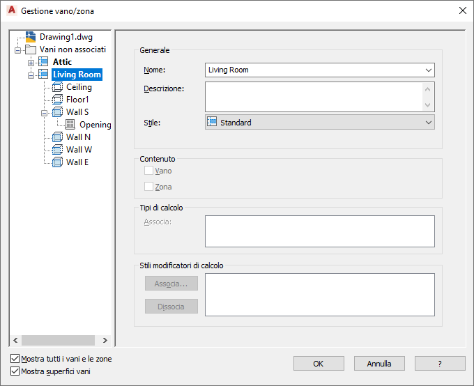 Per visualizzare tutti i vani nel disegno, con tutte le superfici e le relative aperture, verificare che le opzioni Mostra tutti i vani e le zone e Mostra superfici vani siano selezionate.