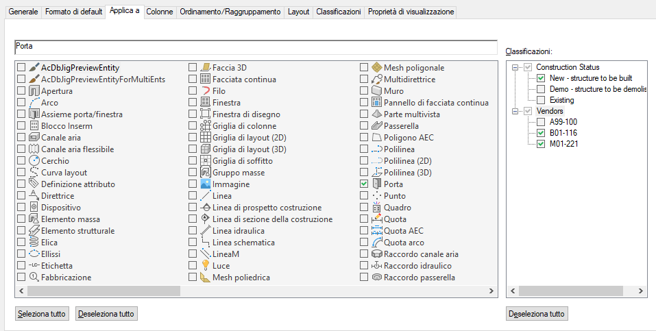 Tutte le definizioni di classificazione che si applicano agli stessi oggetti a cui si applica la definizione gruppo voci di computo vengono visualizzati sulla destra con un elenco delle rispettive classificazioni. In presenza di classificazioni selezionate, la definizione gruppo voci di computo può essere applicata solo a quegli oggetti, stili e definizioni selezionati a sinistra e relativi a tutte le classificazioni selezionate a destra.
