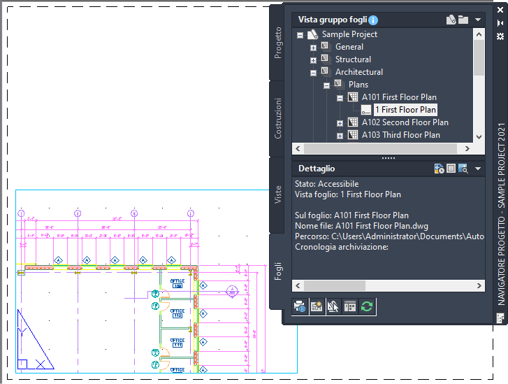Un disegno della vista viene creato selezionando costruzioni nel Navigatore progetto e creando riferimenti ad esse nel disegno. Quando si creano viste a più livelli, il riferimento ad ogni costruzione viene stabilito in base all'altezza del livello relativa, con il livello più basso inserito all'altezza Z = 0.