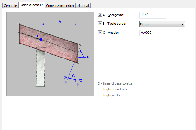 Per specificare i valori di default relativi alla profondità della sporgenza, al taglio del bordo e all'angolo del bordo per i bordi di soletta o soletta del tetto che utilizzano questo stile di bordo, attenersi alla procedura indicata di seguito.