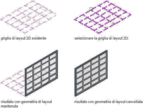 Per creare un assieme porta/finestra basato su una griglia di layout 2D, attenersi alla procedura indicata di seguito. Se in un disegno sono già incluse griglie di layout 2D, è possibile convertirle facilmente in assiemi porta/finestra. Le griglie di layout rappresentano un metodo rapido e semplice per la creazione di un assieme porta/finestra e, una volta acquisita familiarità con tali elementi, è possibile eseguire prove con i comandi relativi agli assiemi porta/finestra per comprenderne meglio il funzionamento.