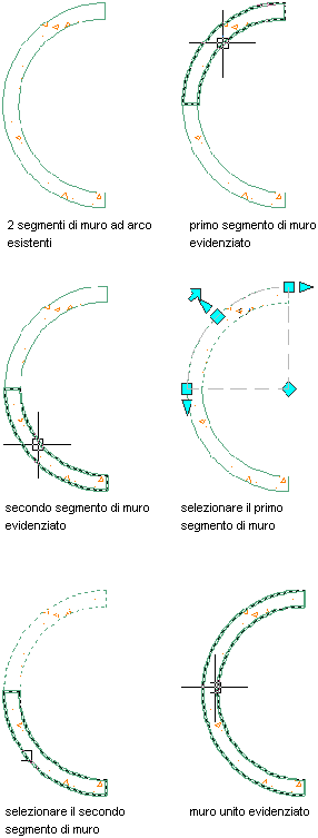 Nella seguente figura è illustrata l'unione di due segmenti di muro curvi eseguita dopo l'evidenziazione di ogni singolo segmento.