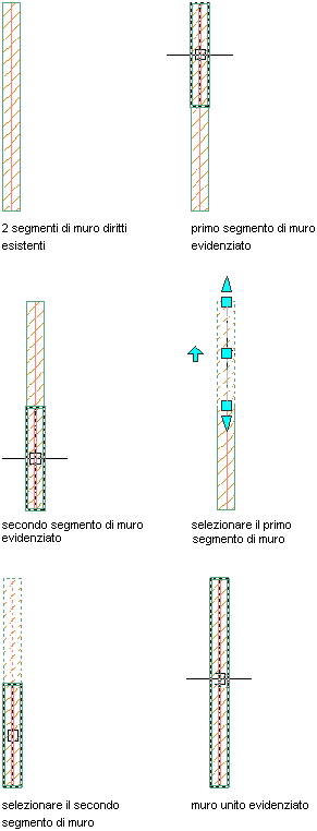 Nella seguente figura è illustrata l'unione di due segmenti di muro diritti eseguita dopo l'evidenziazione di ogni singolo segmento.