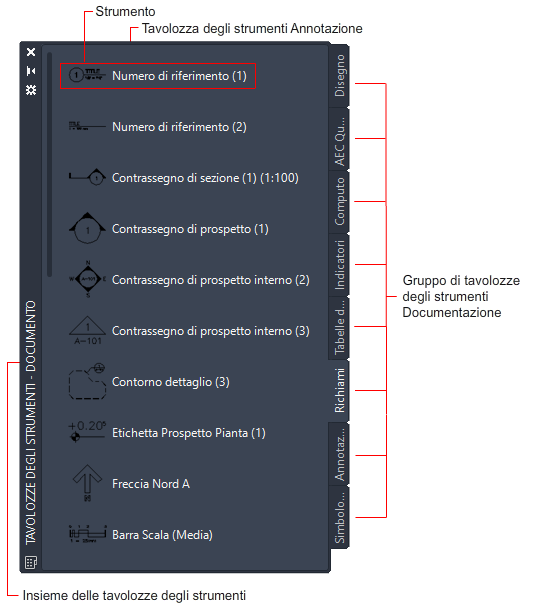 Le tavolozze degli strumenti contengono varie raccolte di strumenti e rappresentano le singole schede di un gruppo di tavolozze. Nel Catalogo di tavolozze campione di Set di strumenti AutoCAD Architecture 2027 sono disponibili numerose tavolozze degli strumenti. È possibile creare nuove tavolozze degli strumenti in Set di strumenti AutoCAD Architecture 2027 oppure nella Libreria. Solitamente gli strumenti vengono inseriti nelle tavolozze in base al tipo di strumento o alla fase di progettazione. Ad esempio, si potrebbero inserire tutti gli strumenti Muro in una tavolozza denominata Muri o tutti gli strumenti concettuali preliminari in una tavolozza denominata Studio delle masse. Quando si crea una tavolozza degli strumenti nella Libreria, è possibile collegarla ad Set di strumenti AutoCAD Architecture 2027. Se la tavolozza degli strumenti viene aggiornata nella Libreria, viene aggiornata anche quella in Set di strumenti AutoCAD Architecture 2027. Questa funzione è utile per progetti di grandi dimensioni, in cui è necessario garantire la coerenza di stili e strumenti.