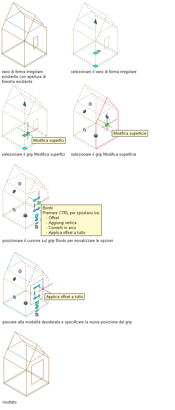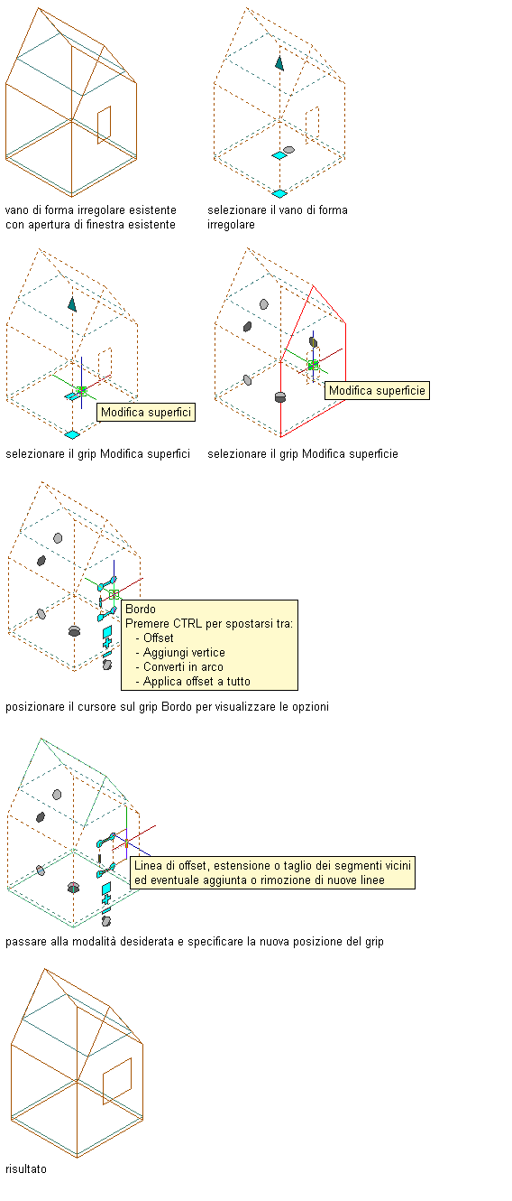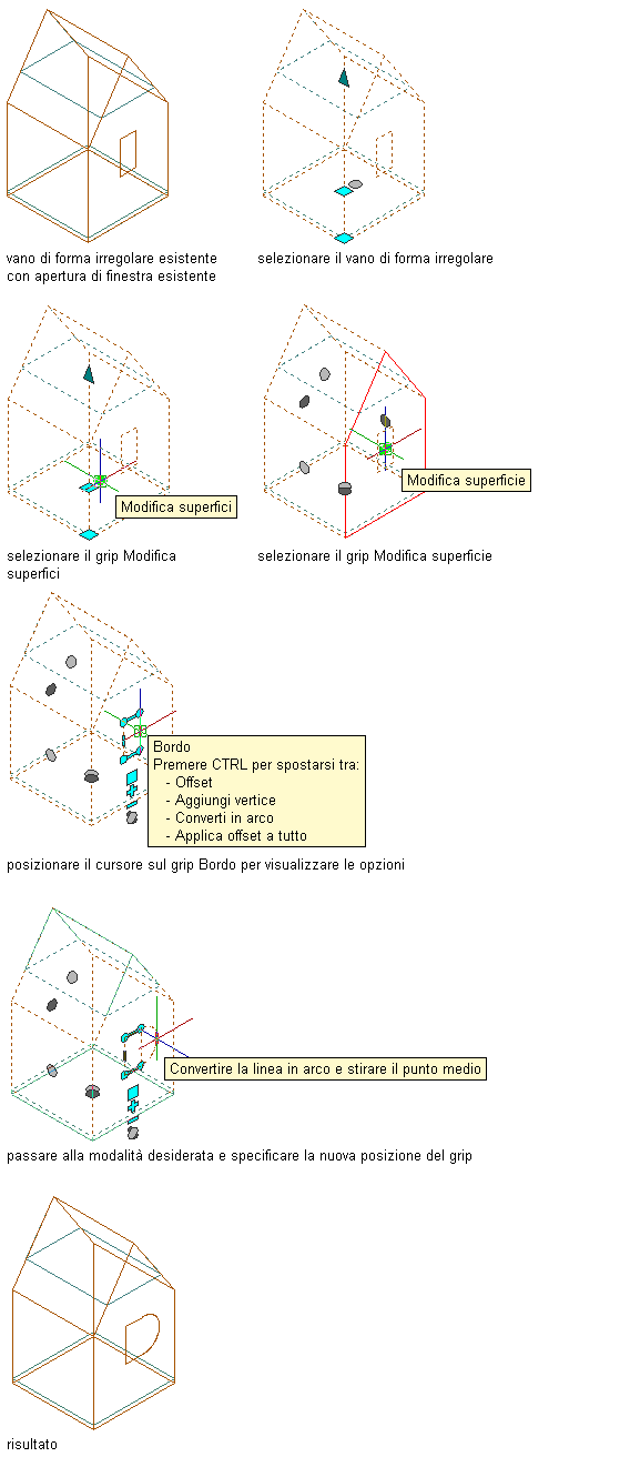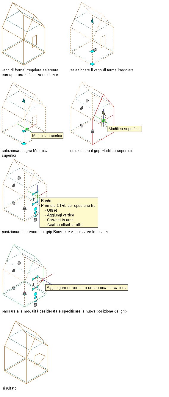 Le aperture delle superfici di un vano di forma irregolare 3D possono essere modificate come qualsiasi contorno basato su profilo in Set di strumenti AutoCAD Architecture 2027. Il contorno dell'apertura presenta grip Vertice e Bordo per generare la forma desiderata.