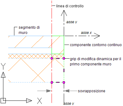 Spesso gli stili dei muri utilizzati presentano uno o più componenti attorno alla mazzetta o all'apertura. Ad esempio, un componente muro di mattoni in alcuni stili di muro termina in corrispondenza della mazzetta. Per tale motivo, una linea di controllo parallela all'asse Y delinea la faccia del componente più interno. I componenti rimanenti nello stile di muro iniziano da questa linea di controllo, lungo la quale vengono visualizzati i grip iniziali.