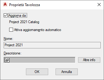 Se si seleziona Attiva aggiornamento automatico ogni volta che si avvia il software, tutte le tavolozze degli strumenti collegate vengono aggiornate per propagare eventuali modifiche apportate alla tavolozza degli strumenti e al relativo contenuto nel catalogo di strumenti.