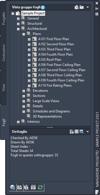 Nella scheda Fogli del Navigatore progetto è possibile creare e organizzare i fogli per il progetto. I fogli fanno riferimento a viste e sono utilizzati per la stampa dei disegni.