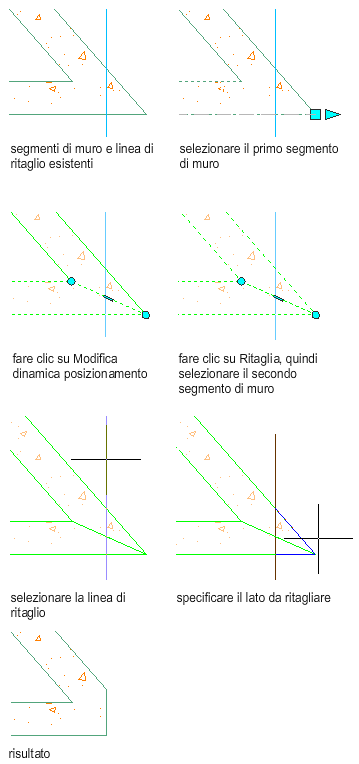 Nell'esempio seguente un angolo di muro in calcestruzzo viene tagliato in base ad un contorno di ritaglio.