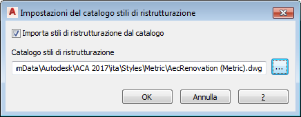 Per default, il catalogo stili di ristrutturazione (AecRenovation.dwg) viene installato in ProgramData\Autodesk\ACA <versione>\ita\Styles. Se il catalogo stili di ristrutturazione viene rinominato o spostato, gli stili vengono disattivati e non è possibile accedervi. Utilizzare la finestra di dialogo Impostazioni del catalogo stili di ristrutturazione per specificare un catalogo valido.