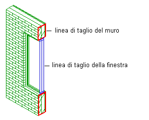 Ad esempio, nel taglio di un muro di mattoni contenente una finestra, è possibile specificare un colore uniforme per la linea di definizione o utilizzare un colore laddove la linea di sezione taglia il muro e un altro colore laddove taglia la finestra. Per utilizzare un colore uniforme per il componente Linea di definizione, assegnargli un colore e non utilizzare le proprietà del materiale. Per ottenere una linea di definizione con un colore determinato dagli oggetti della sezione, utilizzare le proprietà del materiale. Nel caso di una sezione attraverso un muro di mattoni con una finestra, è possibile utilizzare una linea di definizione rossa per il taglio lungo il muro e una blu per il taglio lungo la finestra.